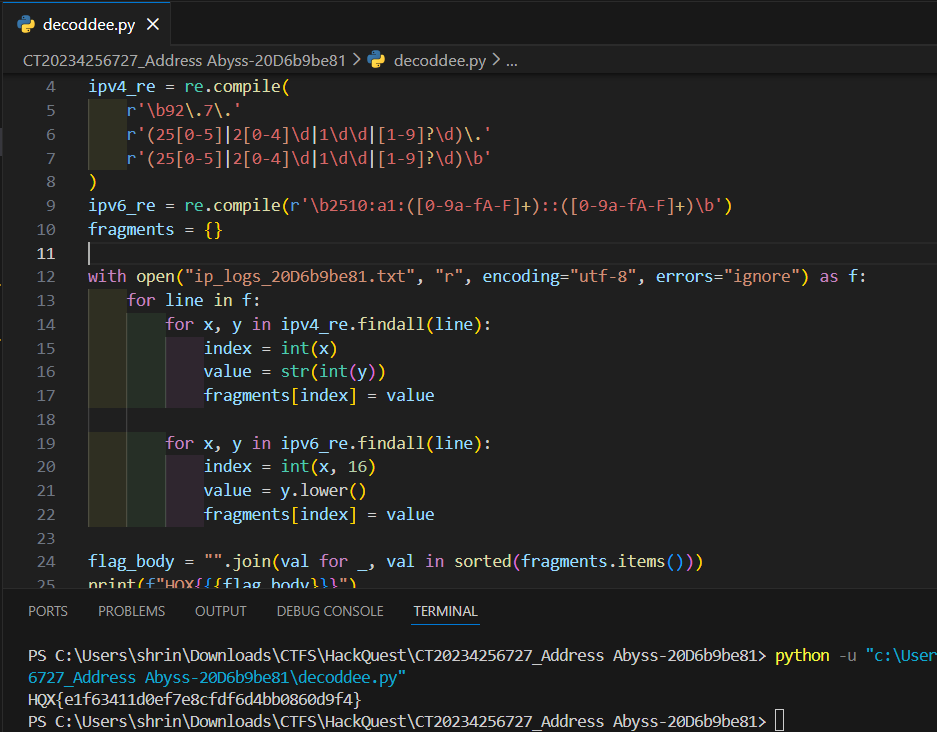 We can take the log file as input, validate each IP address, and extract the index–value pairs from the valid ones. Finally, sorting the values by their index and joining them together reveals the flag.