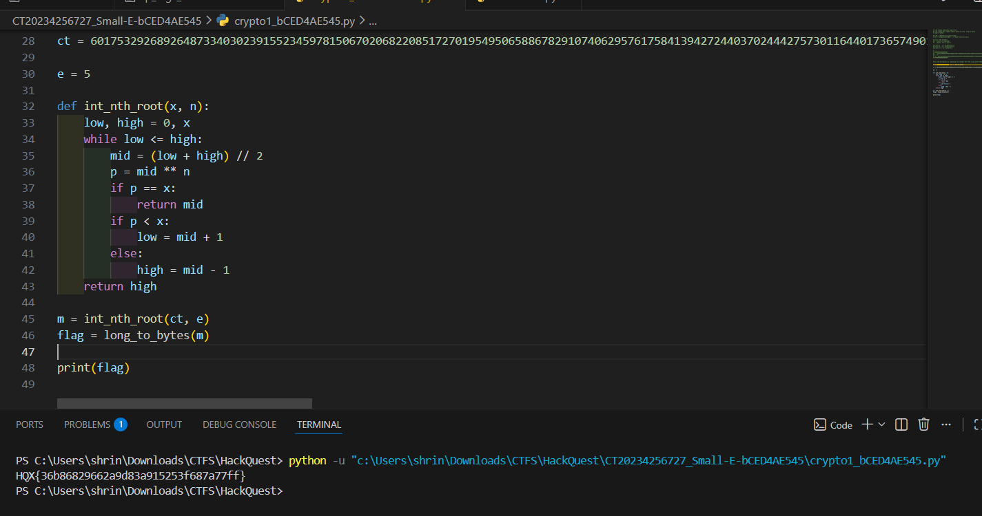 The code looks like an RSA low-exponent attack, which means we can reverse it to recover the flag.