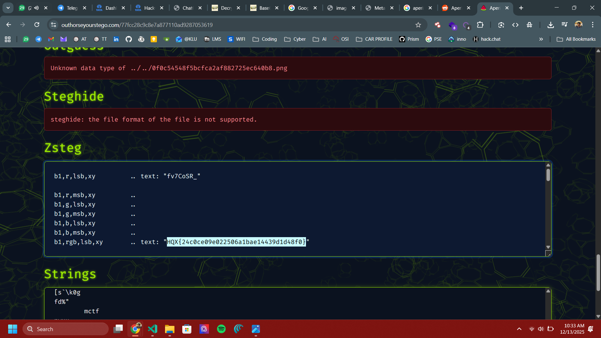The image appeared to involve a steganography-related issue. A basic automated scan was performed using a reliable online steganography analysis platform, AperiSolve (outhorseyourstego.com).